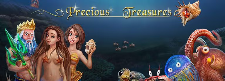 There are many underwater slots games in the marketplace, but not as beautiful and clear as Precious Treasure slots by Spinomenal starts with a small movie clip welcoming players to the game and introducing them to the different mermaids. Fifteen paylines offer payouts through online and mobile access when matching the same symbols on the screen. And the colorful symbols in the game include crabs, jellyfish, mermaids, tortoises, octopus, seashells, fish, treasure chests, and King Neptune himself, the underwater leader.